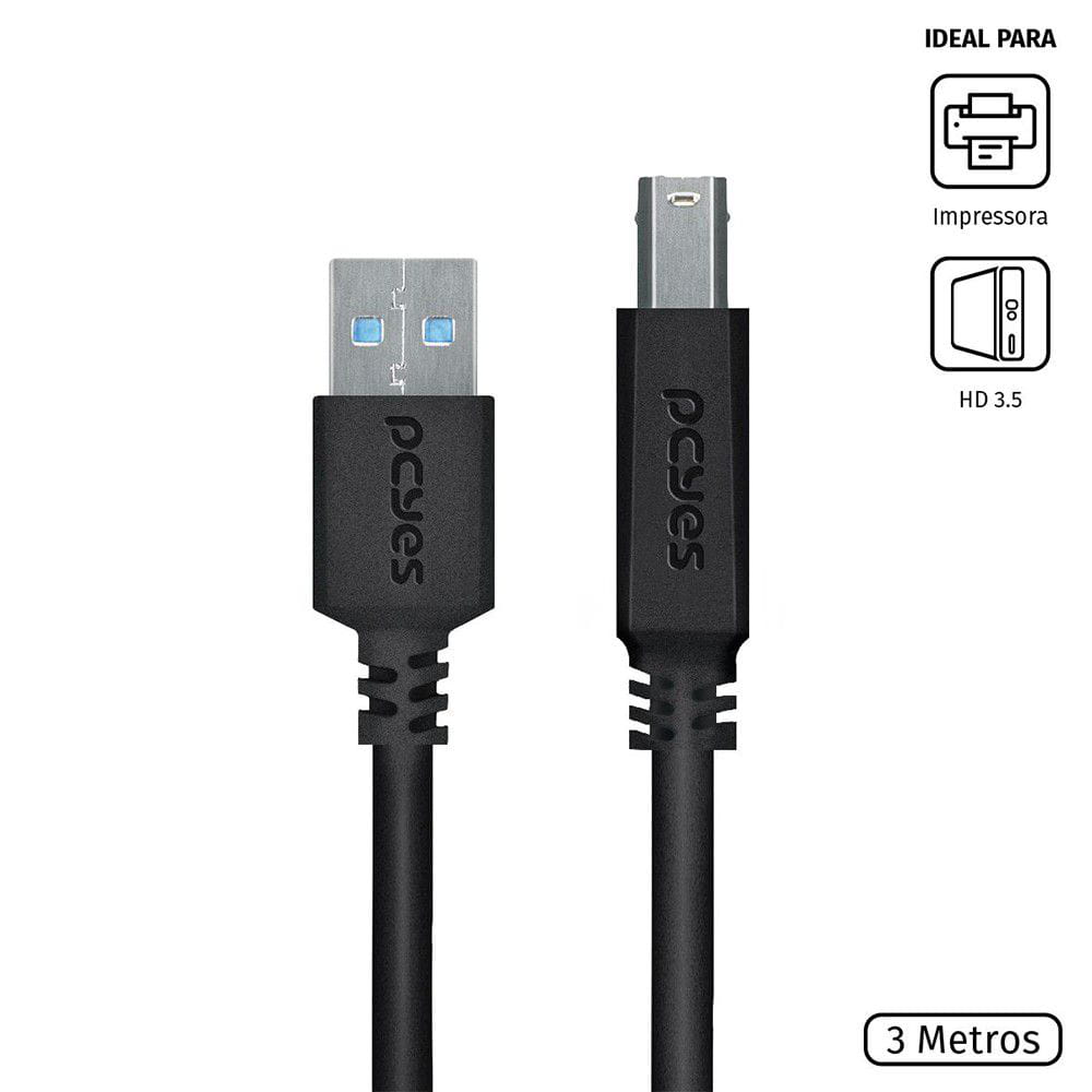 Cabo Para Impressora e HD Externo 3 Metros, PCYes, USB A 3.0 Macho x USB B 3.0 Macho, Preto - PUABM3-3 |
